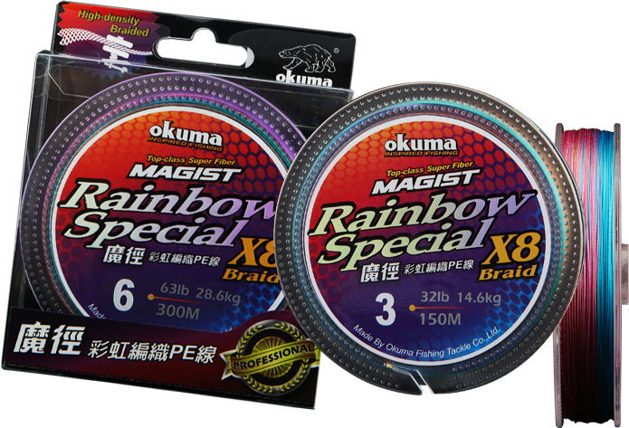 OKUMA新推出的“魔徑”彩虹8股編織線,採用魔徑系列的獨家高密度編織;與一般PE線相同線徑下,擁有更高的拉力值與強度,滑順度更好讓你拋投更順暢。如彩虹般的五色線,在各種水域中都能清楚辨識,每一色大約10米,幫助你輕鬆掌握出線距離,並且躲避障礙安心搏魚。魔徑彩虹8股編織線包裝上有150M或300M包裝可以選擇,號數有0.8號~6號,適合淡水路亞、海水路亞、船釣、水庫、鐵板、岸拋、軟絲……等各種釣法。覺得的單色母線常常讓您找不到釣組方位;或是釣組深度模不著頭緒嗎?魔徑彩虹8股編織線協助您解決以上問題!