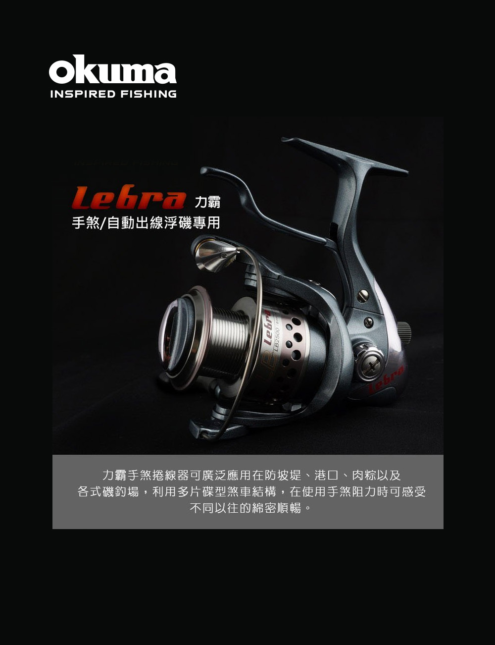 力霸手煞捲線器可廣泛應用在防坡堤、港口、肉粽以及各式磯釣場,利用多片碟型煞車結構,在使用手煞阻力時可感受不同以往的綿密順暢。2500規格除了原線杯以外,再附贈一組3000型線杯,作釣當下更換母線釣組更加方便。●專利多片碟型煞車結構;煞阻力綿密順暢